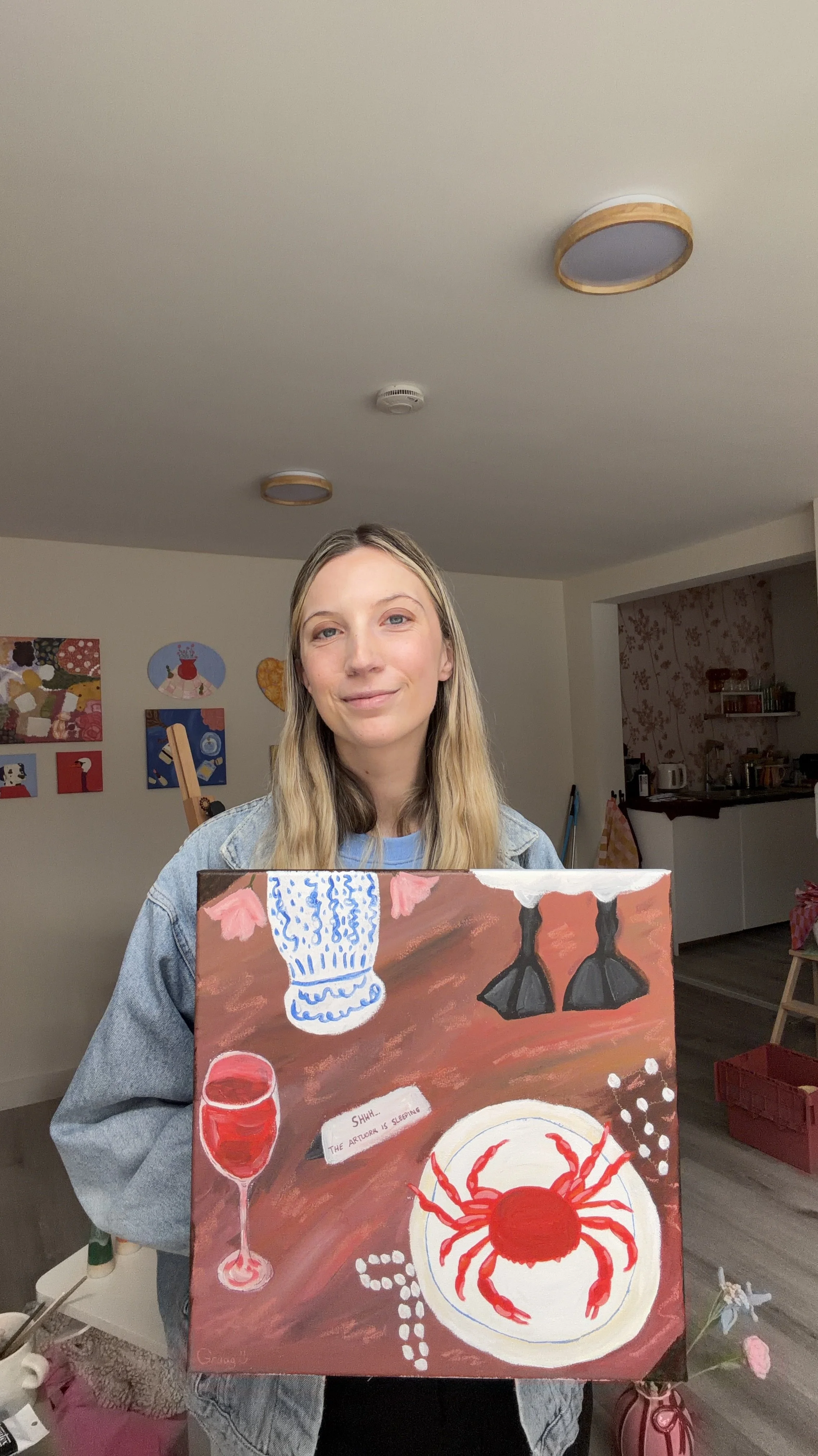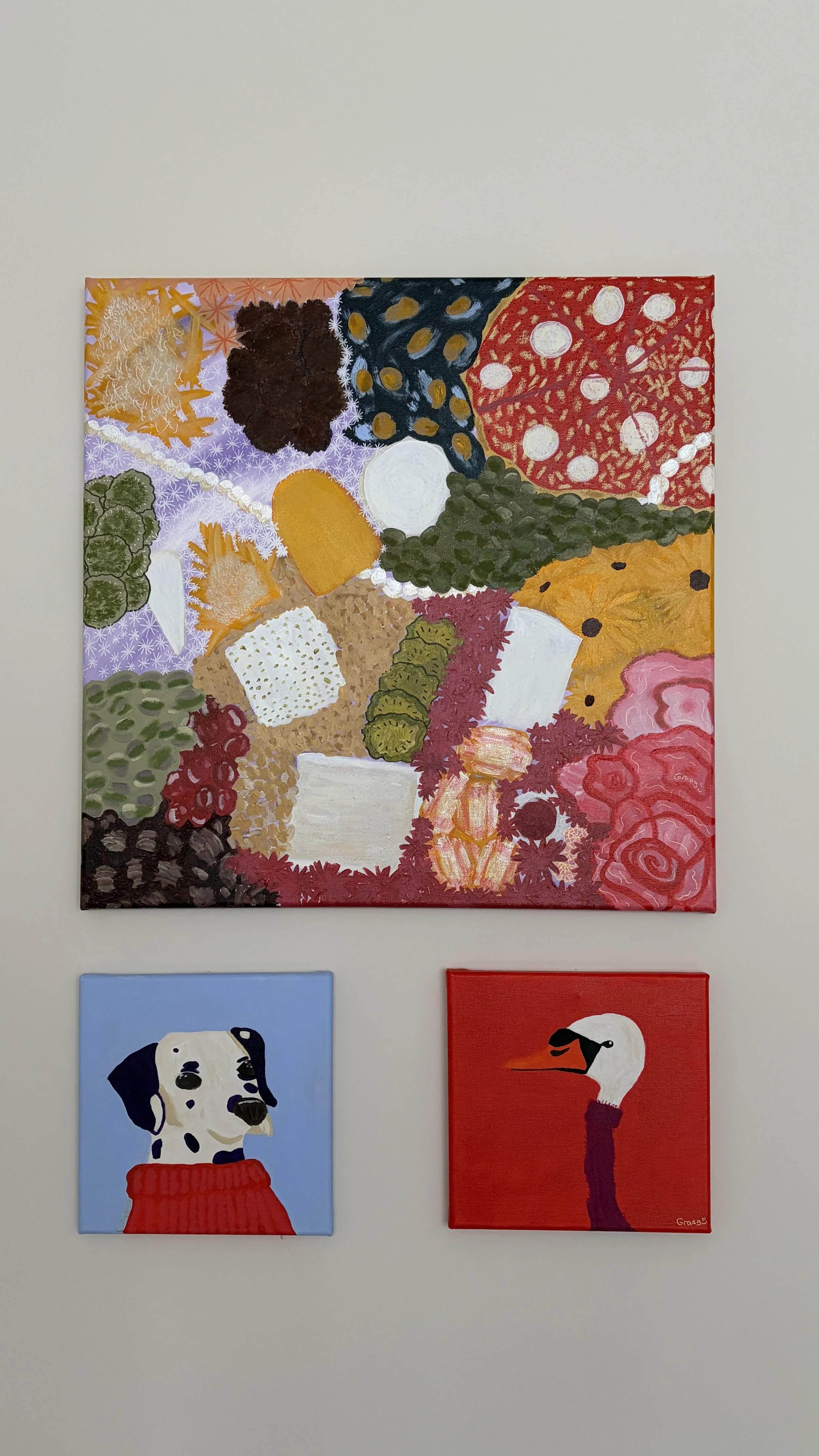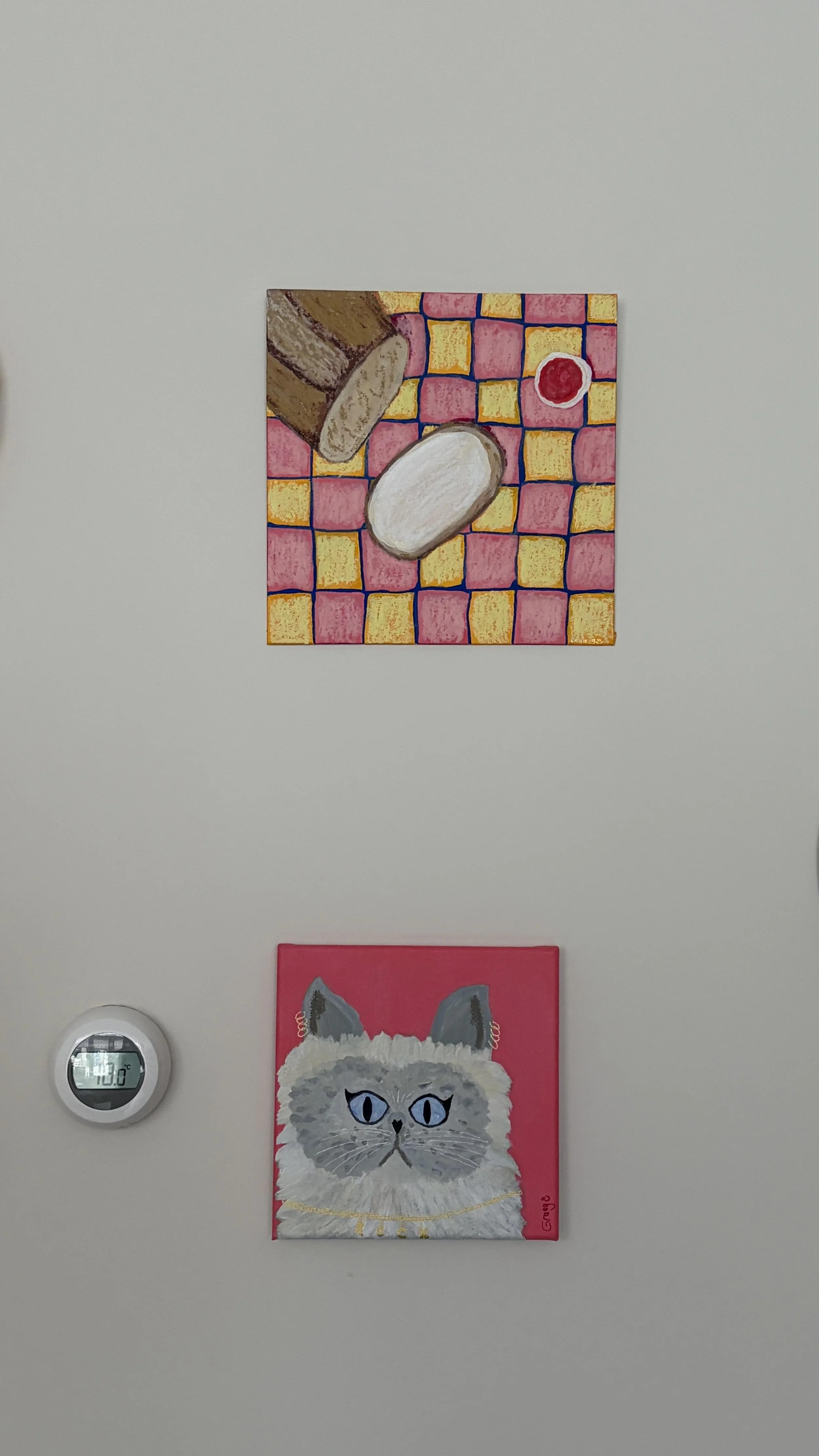 Broodje smeren 25 × 25 cm acryl, oliepastel en acrylstiften. Canvasboard. € 30