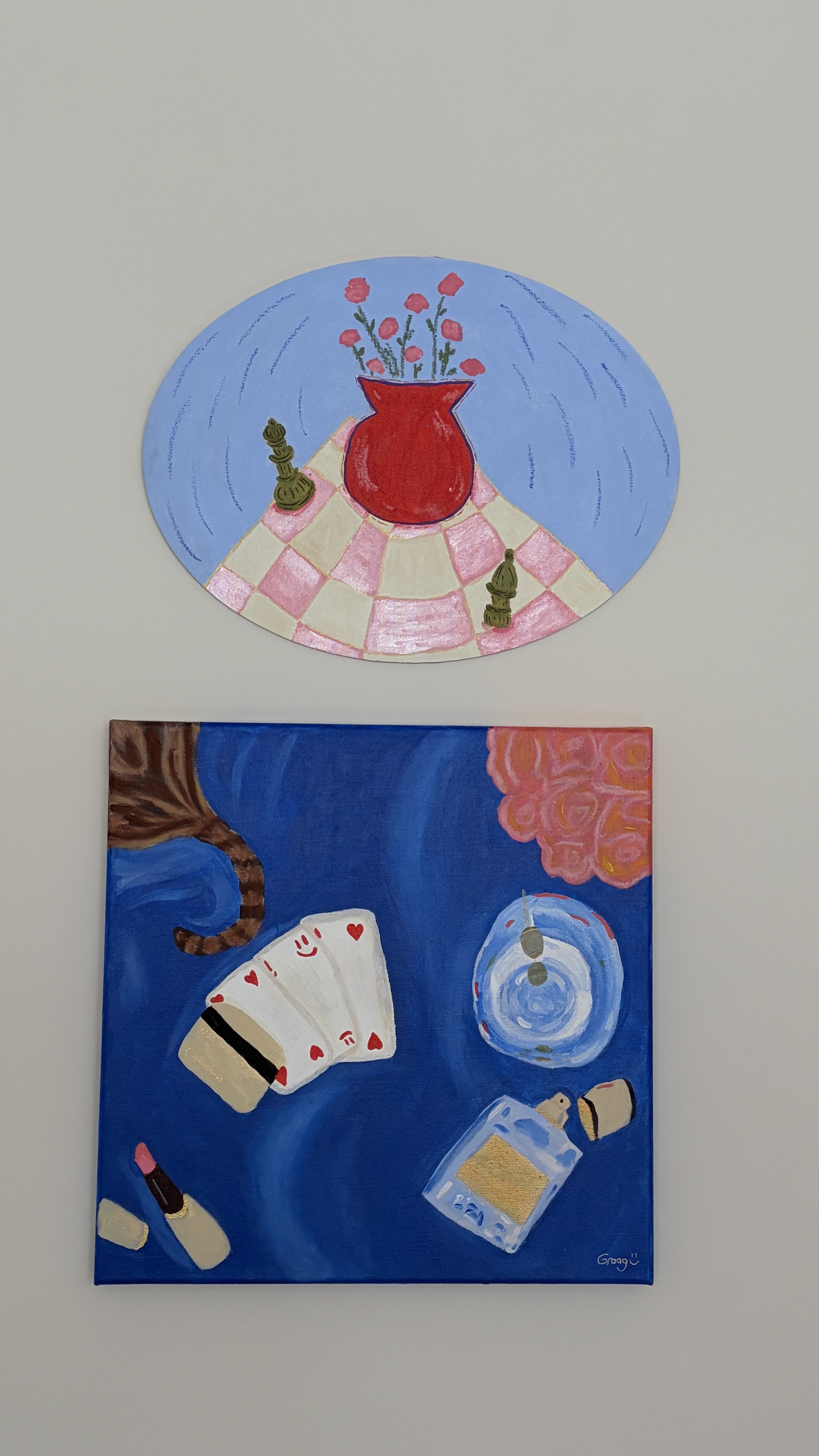 Schaakmat 30 × 40 cm acryl, oliepastel en acrylstiften. Met parelmoer details. € 35